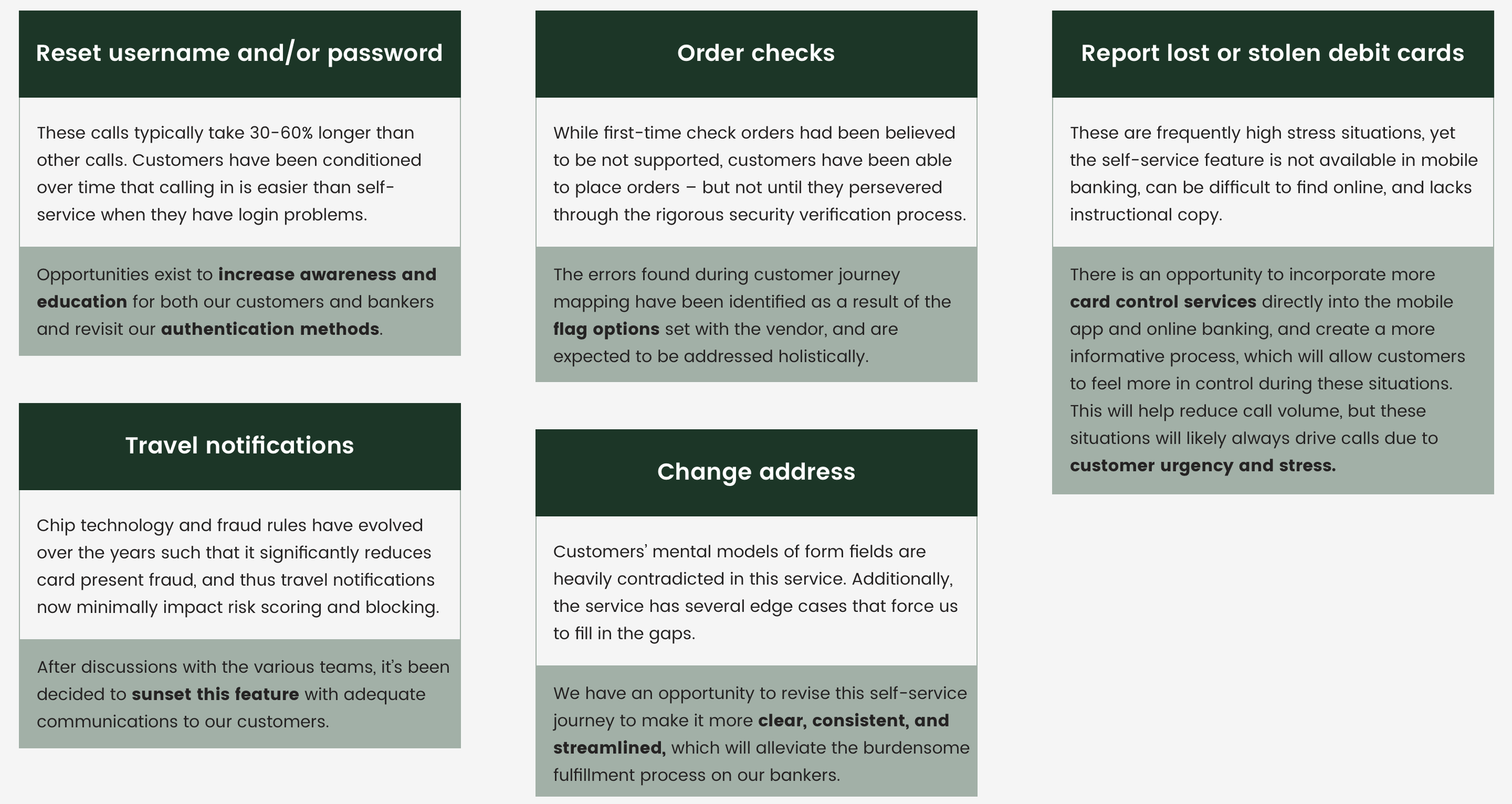 I led the discovery and analysis of digging into several self-service journeys from initial stakeholder interviews, customer journey mapping, service blueprinting, and presenting the findings and recommendations to senior leadership. My recommendations have been implemented on our Online Banking platform and led to a significant decrease in calls to the Customer Contact Center (C3).
